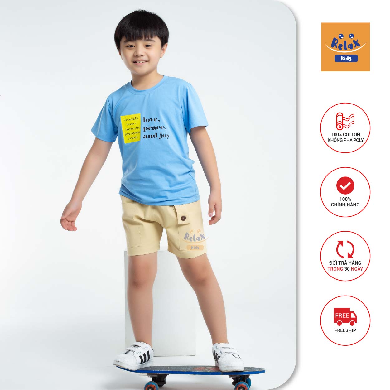 Đồ bé mặc được Relax Kids thiết kế độc quyền với chất liệu vải cotton 100% 𝒌𝒉𝒐̂𝒏𝒈 pha poly, bé mặc vào rất mát, thấm hút mồ hôi cực tốt, đặc biệt chất vải 𝒌𝒉𝒐̂𝒏𝒈 ra màu, 𝒌𝒉𝒐̂𝒏𝒈 xù lông, mom giặt kỹ cho bé là bé sẽ được mặc đồ mới suốt thôi.